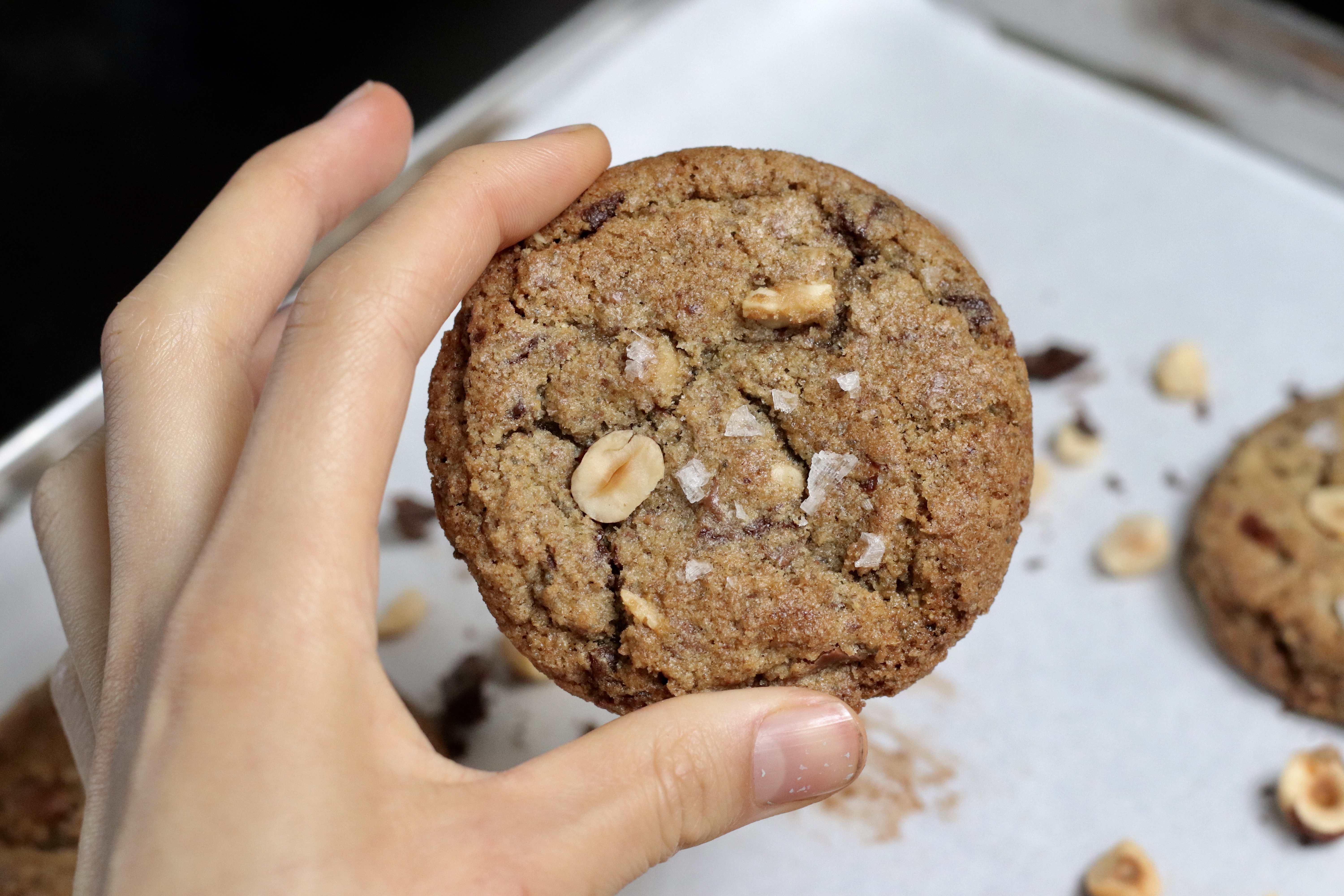 These cookies were created from my desire to use up a forgotten bag of rye flour that was starting to house those annoying little pantry bugs. Through testing these, I realized that rye flour is far superior compared to all purpose flour when used in chocolate chip cookies. My reasons: 1. Rye flour adds a hearty texture that perfectly compliments the caramelized flavor desired in chocolate chip cookies. 2. It yields a cookie that is perfectly crisp on the outside and chewy on the inside. 3. Its nutty flavor adds to the deep toasted flavor of the cookie, while also flawlessly pairing with the chocolate.